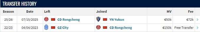 北京时间7月15日,德转更新,成都蓉城边后卫唐淼转会云南玉昆,转会费约60万人民币。